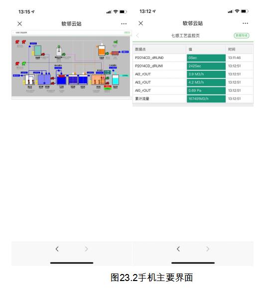系统提供手机移动应用,使污水处理厂可以在移动互联网络,实现工艺数据、报表数据的查看,功能包括设备查看、报表查询、历史数据。